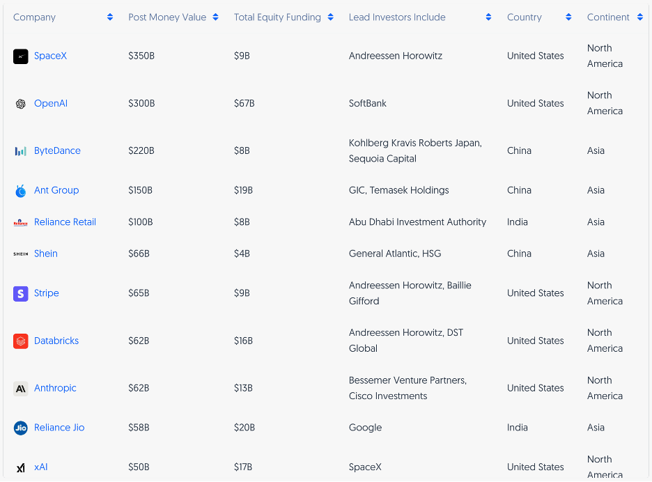 İlk 15’te, en az 7 şirketin temel işi yapay zeka ile sıkı sıkıya bağlantılı: OpenAI (300 milyar dolar), Databricks (62 milyar dolar), Anthropic (62 milyar dolar), xAI (50 milyar dolar) vb. Sermaye, özellikle üretken yapay zeka alanında büyük bir heves gösteriyor. En iyi yapay zeka şirketleri devasa fonlar çekiyor; örneğin, OpenAI’nin toplam finansmanı 67 milyar dolara ulaştı. Bu, yapay zeka rekabetinin sermaye yoğun bir “silahlanma yarışı” haline geldiğini gösteriyor.